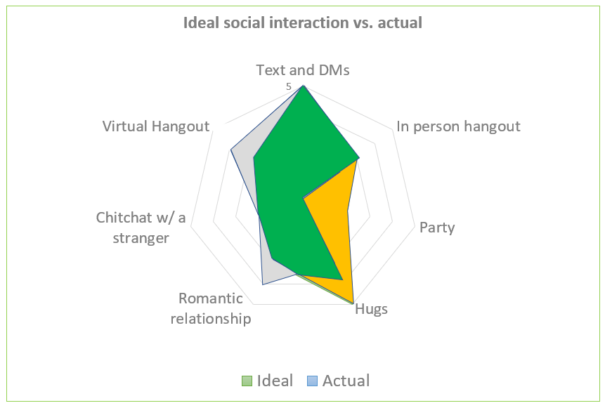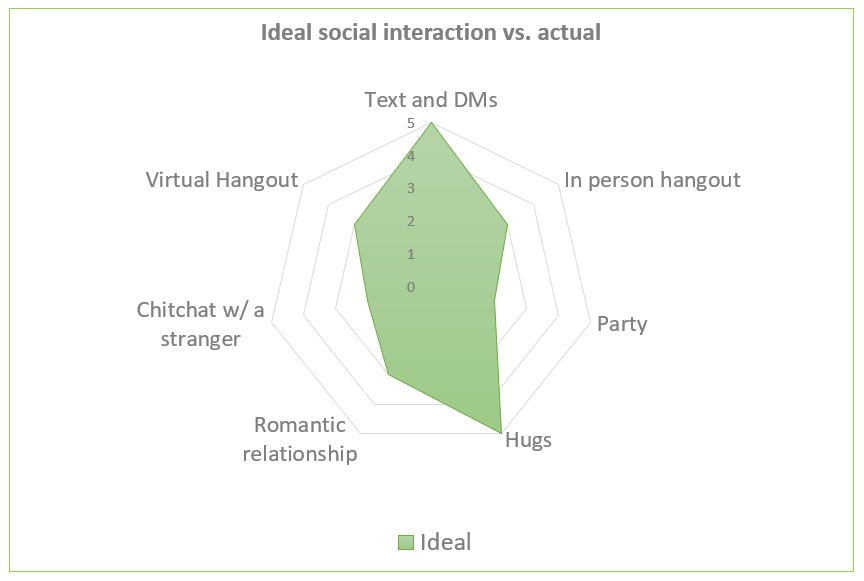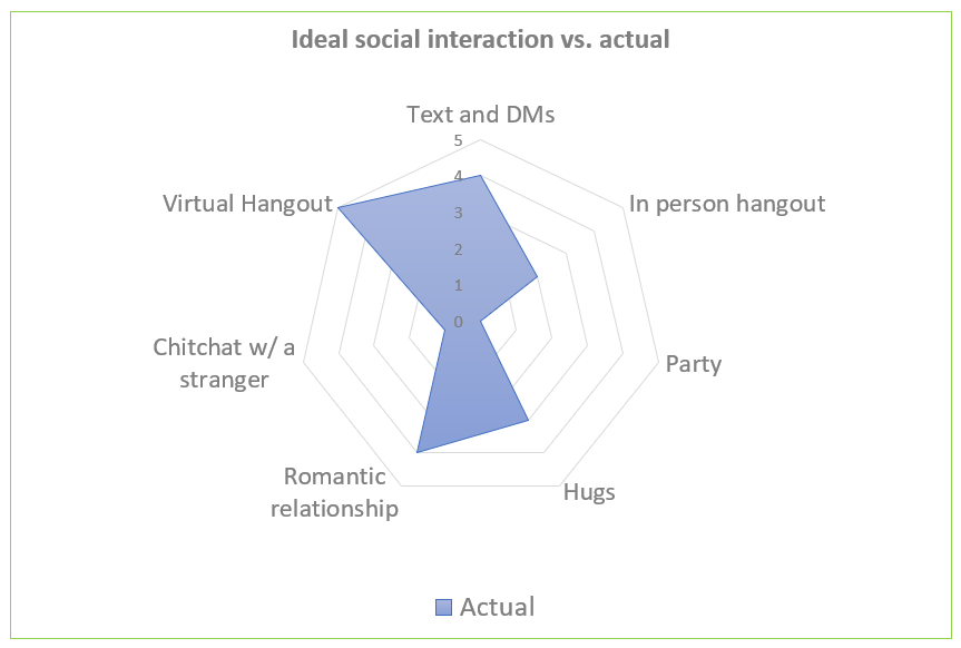 Description of the graph: Title: Ideal social interaction versus actual – only actual scores shown. Scores in clockwise order from top (1) Text and DMs – 4, (2) In-person hangout – 2, (3) Party – 0, (4) Hugs – 3, (5) Romantic relationship – 4, (6) Chitchat with a stranger – 0, (7) Virtual hangout – 5.