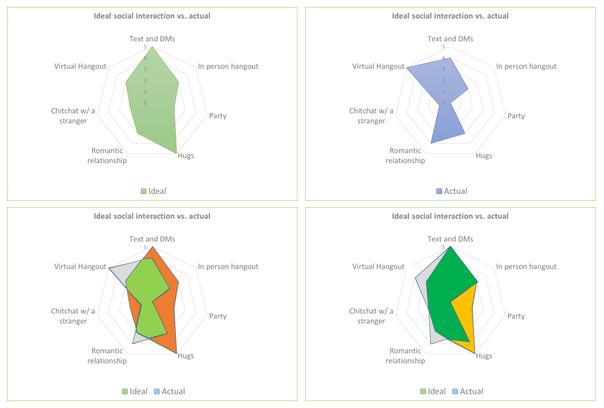 The graph below shows what small tweaks can be made to create a much greater overlap. In this, they have increased text and DMs slightly, added one in-person hangout, asked for a hug, had two small interactions with a stranger, and opted out of one of five virtual hangouts. The results are much more in line with their ideal situation.