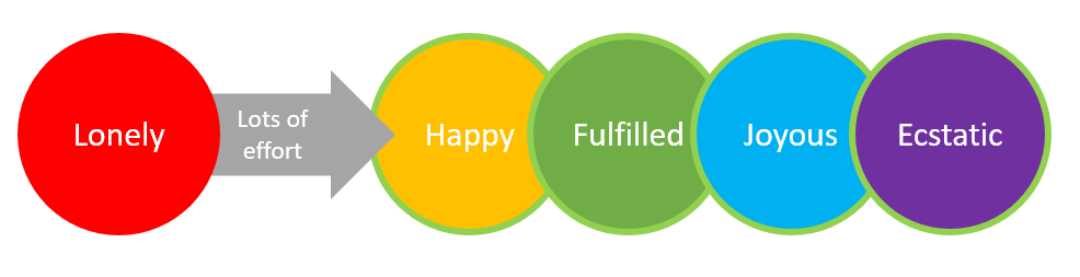 Side note: It’s tempting to think of not-lonely as the same as “contentment”, but doing so undermines the binary thinking pattern which supports behavior change. If I made a breakout of the definition of “contentment” the list would not map 1:1 in opposition to the “lonely” definition and I would end up with certain factors of my loneliness not addressed.