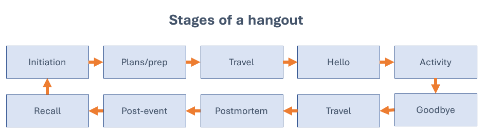 These are my stages of a hangout. Each of these can have multiple stressors for people with social anxiety or overwhelm. Even people who generally enjoy events can underestimate the impact of stages that they generally gloss over. I’ll do a quick overview of this and then make separate posts for certain stages later.