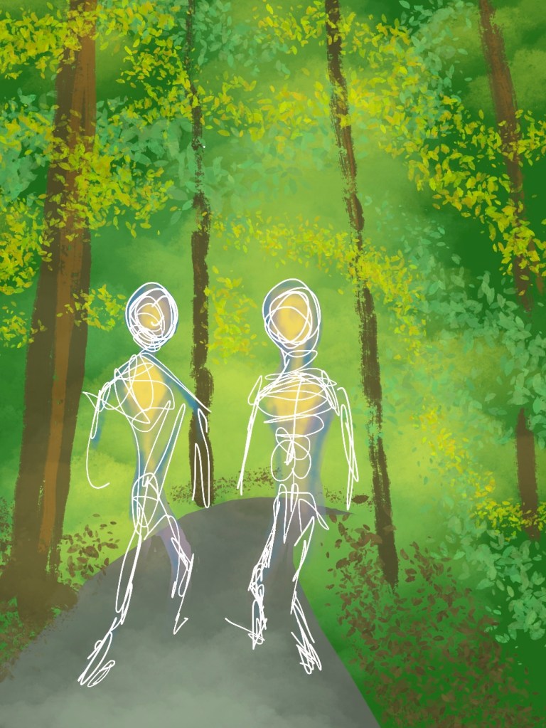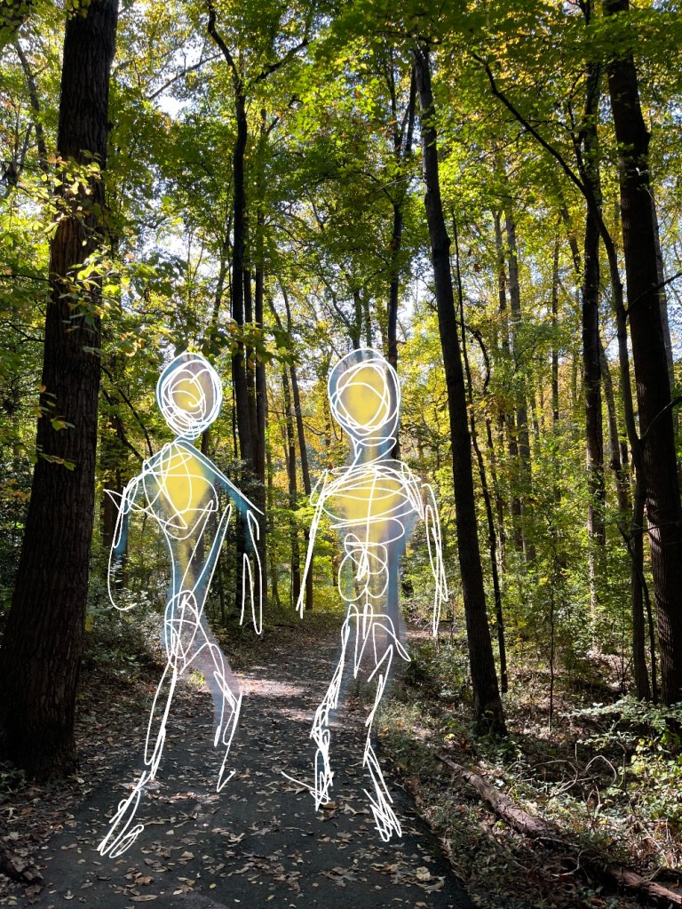 For the portion of the walk that was in the forest, my memory may function more like this image below. I have a general impression of trees and foliage, a path we are walking on, and two people existing on the path. Working memory creates a shorthand in the brain so that we can concentrate on other things when setting/walking is on autopilot.