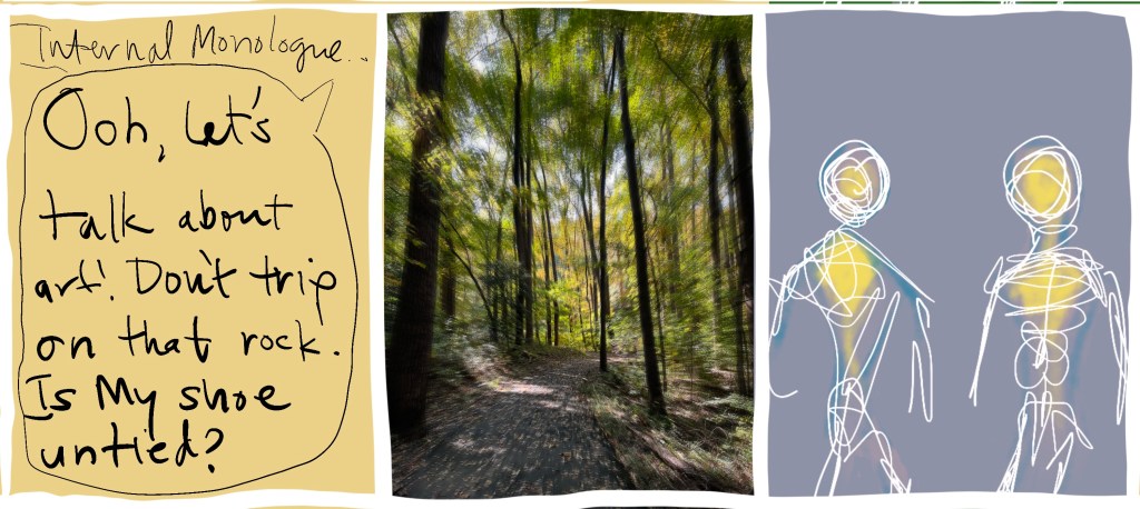 Because I was able to be on autopilot, my memory of the walk is a series of different inputs and processing that I toggled between while walking and being social. Like the image below, I experienced my internal monologue, and then experienced motion through the forest, and then focused on the conversation between me and my friend.