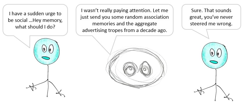 - A sensory input triggers the surfacing of a memory, which, if positive enough, will induce me to try to recreate that feeling with that person/group (e.g., a picture from a fun night out)