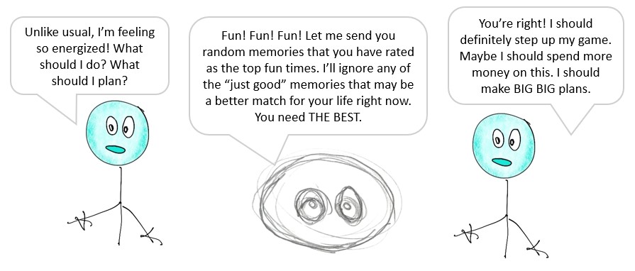 When I am amped up, my memory likes to cherry pick things and ignore consequences. It also is more subject to things embedded in memories like advertising and social status. It likes to search out expensive things or times I threw caution to the wind. Recklessness is a bonus.