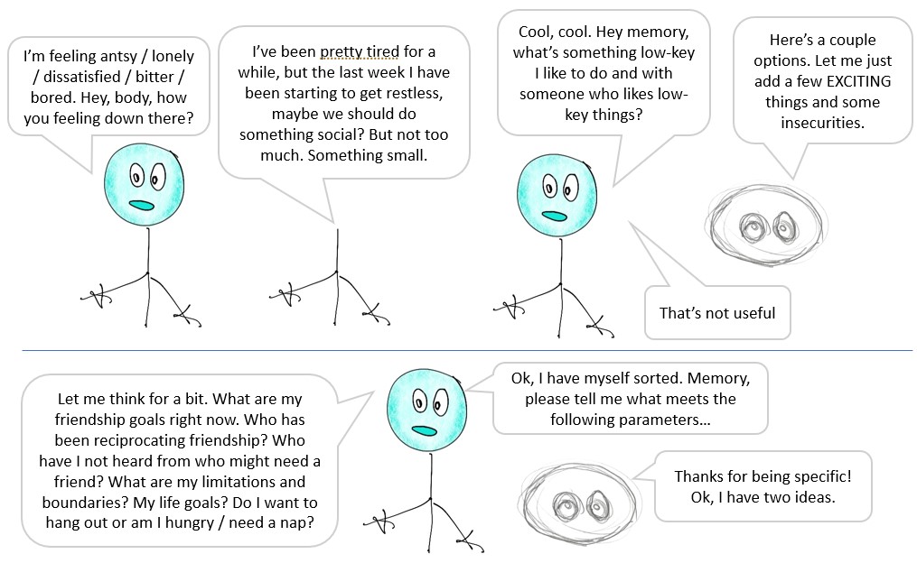 - A sensory input, emotion, or body state triggers an undesirable state, but accessing memories doesn’t surface an acceptable solution and the person chooses something entirely novel. Side note: If I only choose novelty every time, then they will never make friends because friendship requires repeated exposure. Need a solid grounding for this – this is something I just figured out.